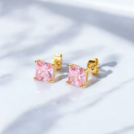 Pink Sparkle Square Studs – 18K vergoldete Edelstahl-Ohrstecker mit Zirkonia