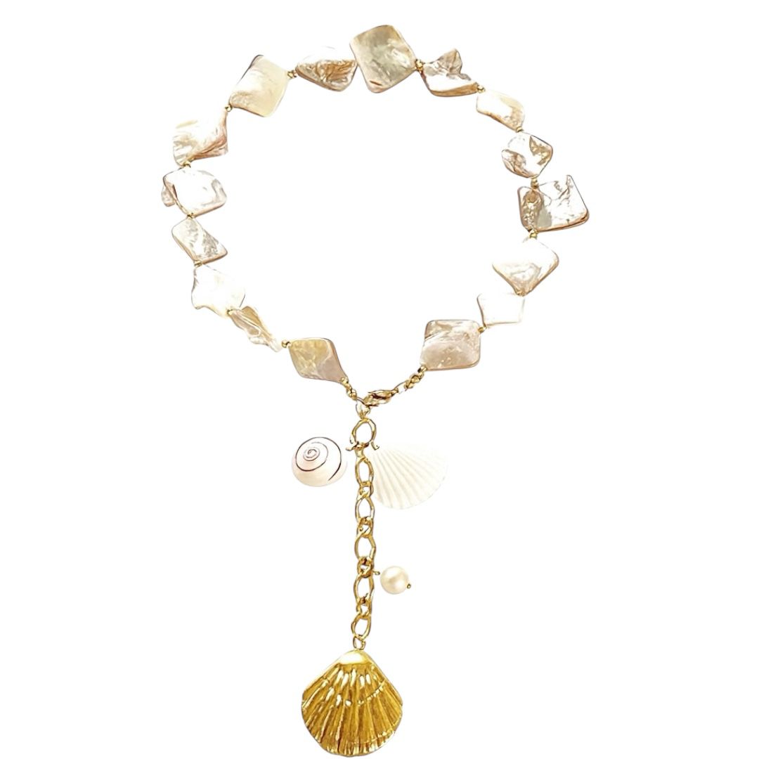 Gefertigt aus irregulären Naturmuscheln, echten Süßwasserperlen und einem edlen Muschel-Anhänger aus 316L Edelstahl, 18K vergoldet (PVD), bringt dieses Schmuckstück einen Hauch von Strand & Sommer in deine Garderobe.